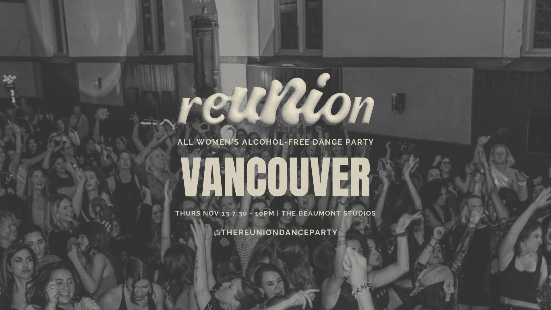 REUNION: All Women’s Alcohol-Free Dance Party (Vancouver, BC) Nov 13 REUNION: All Women’s Alcohol-Free Dance Party (Vancouver, BC) 7:30 pm - 10:00 pm